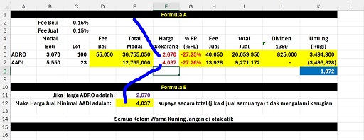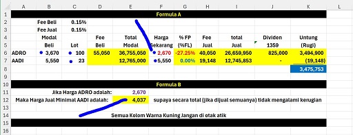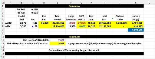 Setelah diisi lengkap, kita bisa langsung mengetahui posisi Total ADRO & AADI kita di harga terakhir