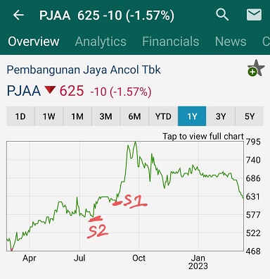 Dan kalau kita pendekin timeframe nya (menjadi 1 tahun) keliatan Support 1 ada di kira kira 620 atau 615 yang kalau sampai ketembus, maka support selanjutnya adalah dibawah 577