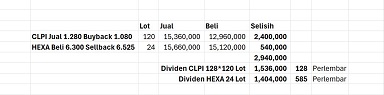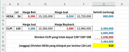 Berarti masih ada sisa uang 1.404.000 yang bisa kita anggap sebagai dividen dari 24 Lot HEXA